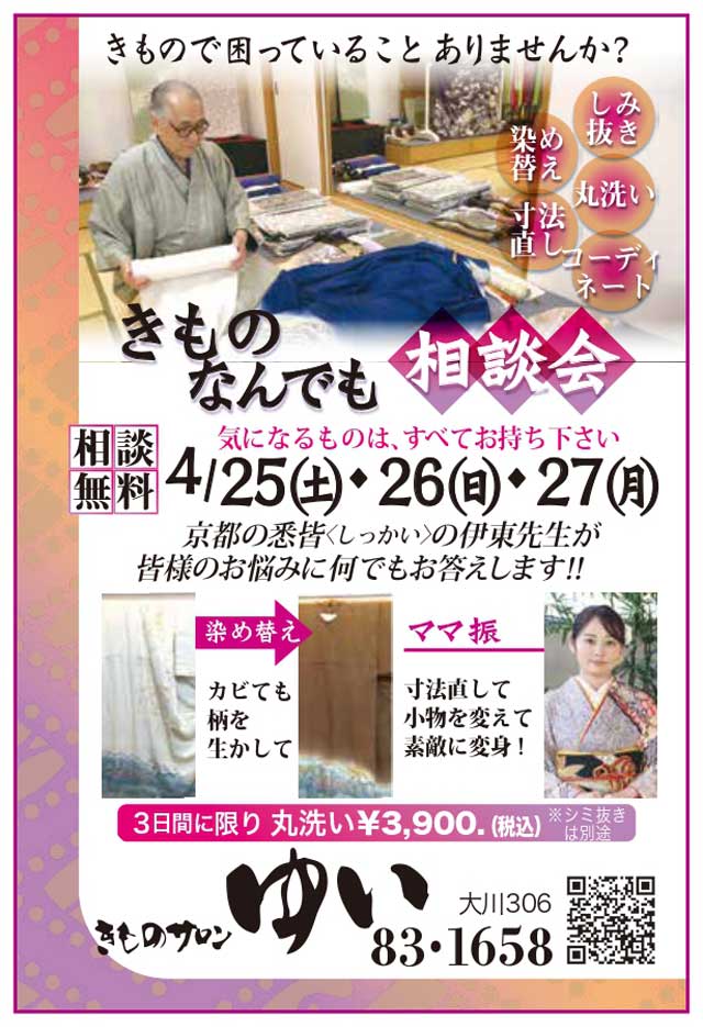 ※シミ抜き、丸洗い、寸法なおし、染めかえ、 コー ディネートなど お気軽に何でもご相談ください!